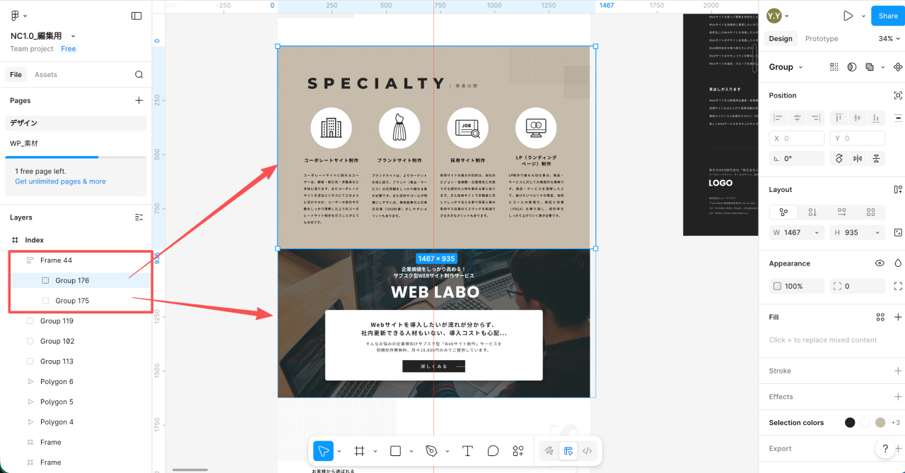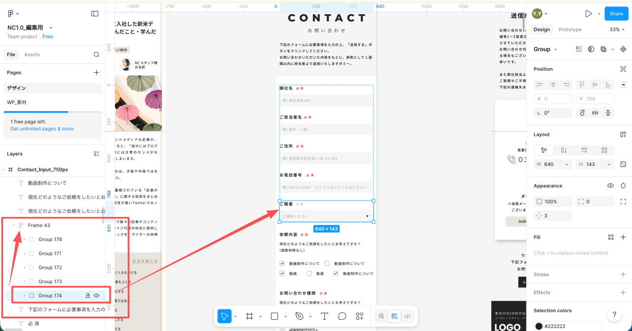 ですので、この「Group57」の要素を更にグループしてオートレイアウトすると、要素が崩れる事なくグループ単位でオートレイアウトが可能になります。