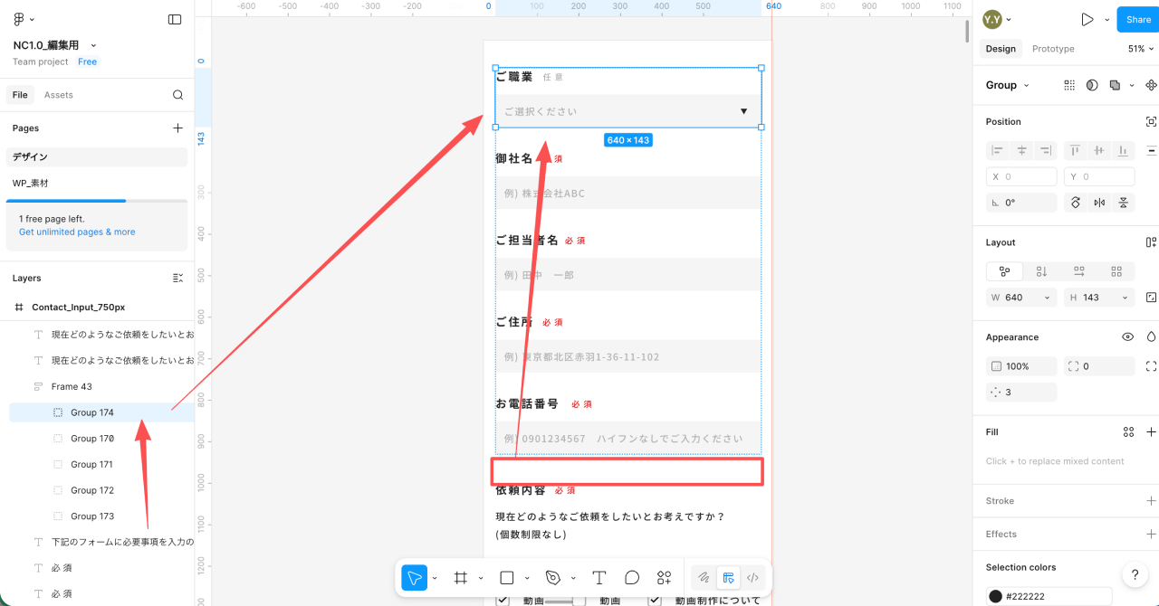 補足ですが、オートレイアウトで以下の要素をグループ化し、コピペして同じ要素を赤枠の場所に置きたい場合、一点気をつける点がございます。